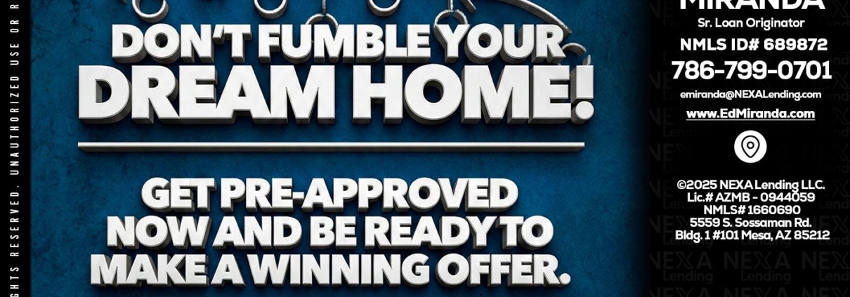 dont fumble - Ed Miranda -Senior Loan OriginatorHi, my name is Ed Miranda. I’m a Loan Officer with NEXA Lending LLC., offering personalized mortgage solutions, fast customized quotes, great rates and service with integrity.