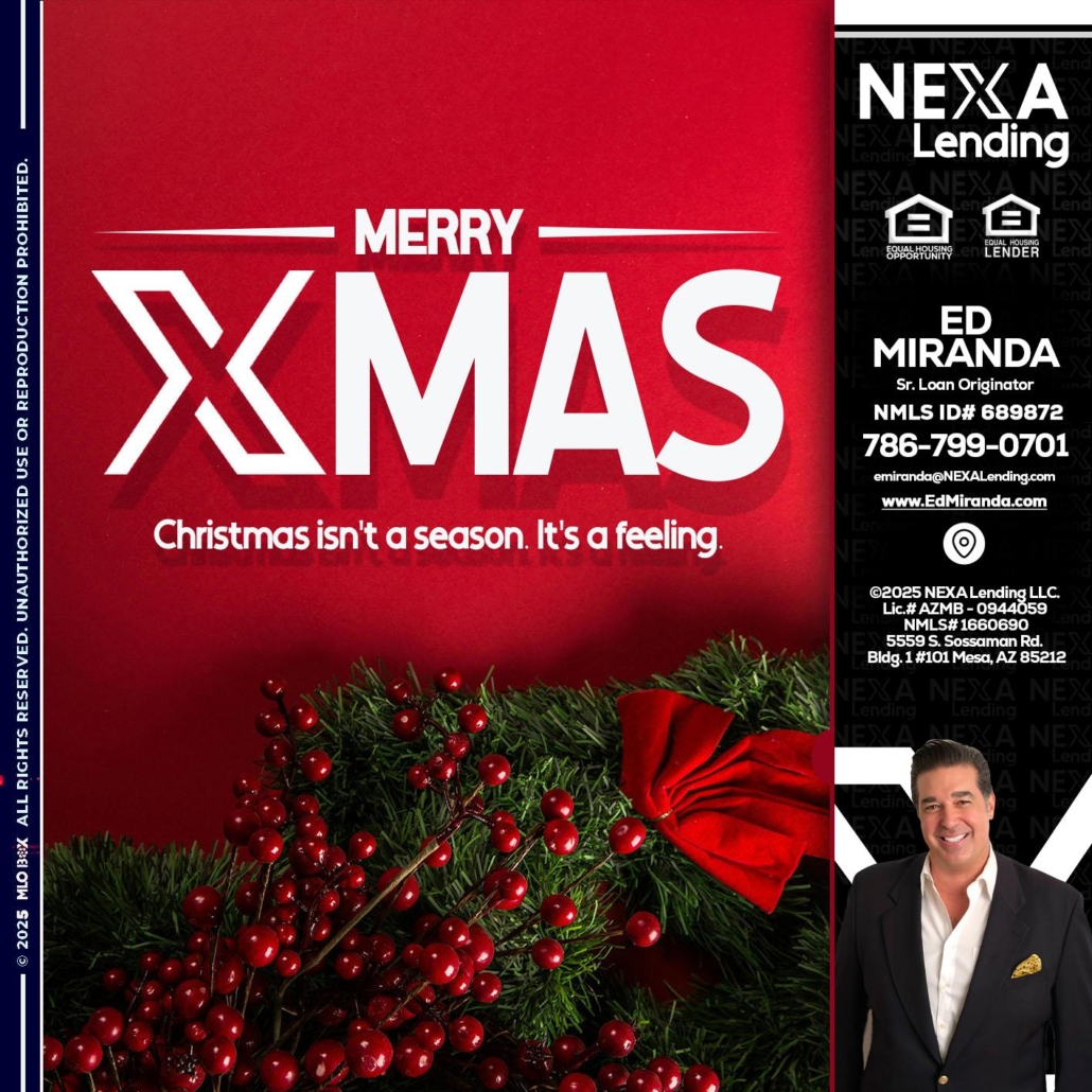 merry xmas - Ed Miranda -Senior Loan OriginatorHi, my name is Ed Miranda. I’m a Loan Officer with NEXA Lending LLC., offering personalized mortgage solutions, fast customized quotes, great rates and service with integrity.