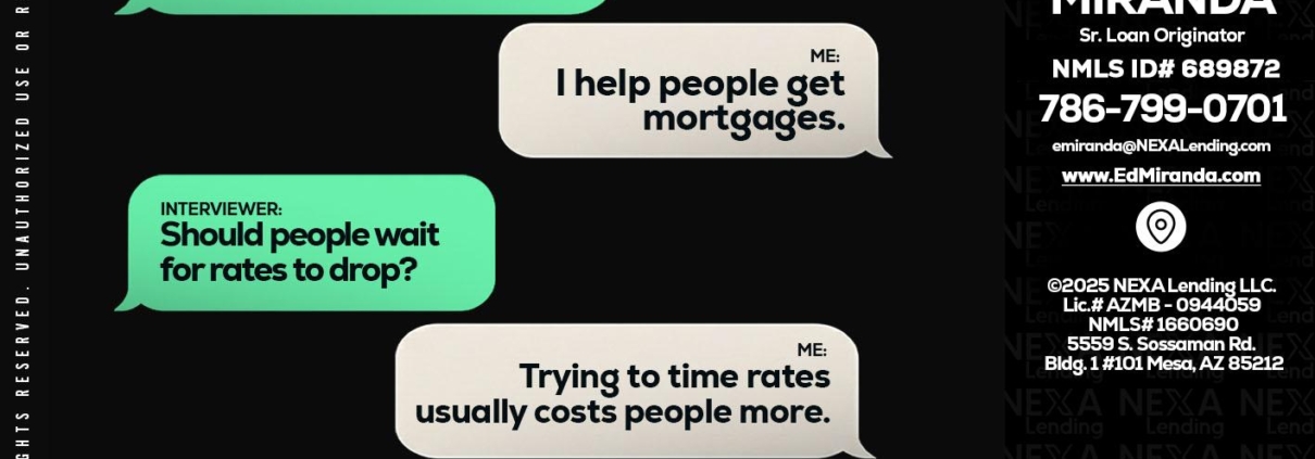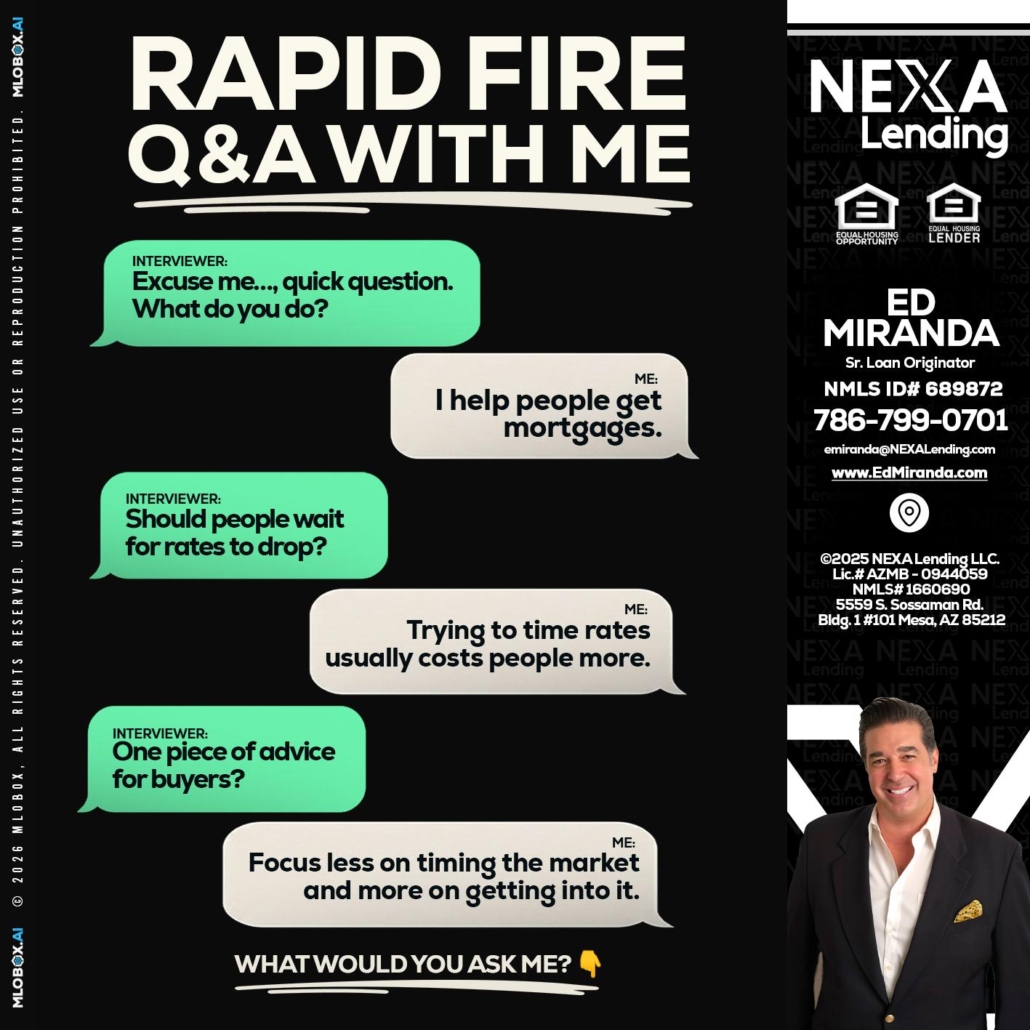 rapid fire - Ed Miranda -Senior Loan OriginatorHi, my name is Ed Miranda. I’m a Loan Officer with NEXA Lending LLC., offering personalized mortgage solutions, fast customized quotes, great rates and service with integrity.