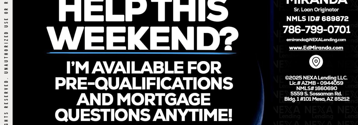 Hi, my name is Ed Miranda. I’m a Loan Officer with NEXA Lending LLC., offering personalized mortgage solutions, fast customized quotes, great rates and service with integrity.